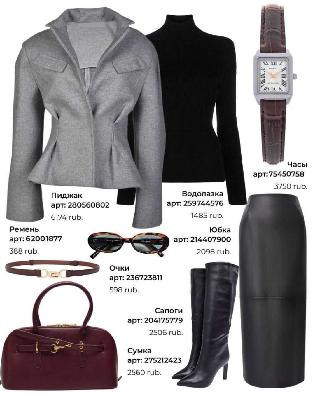 Серый укороченный пиджак и черная кожаная юбка-карандаш создают выразительный образ с акцентом на элегантность и силуэт.