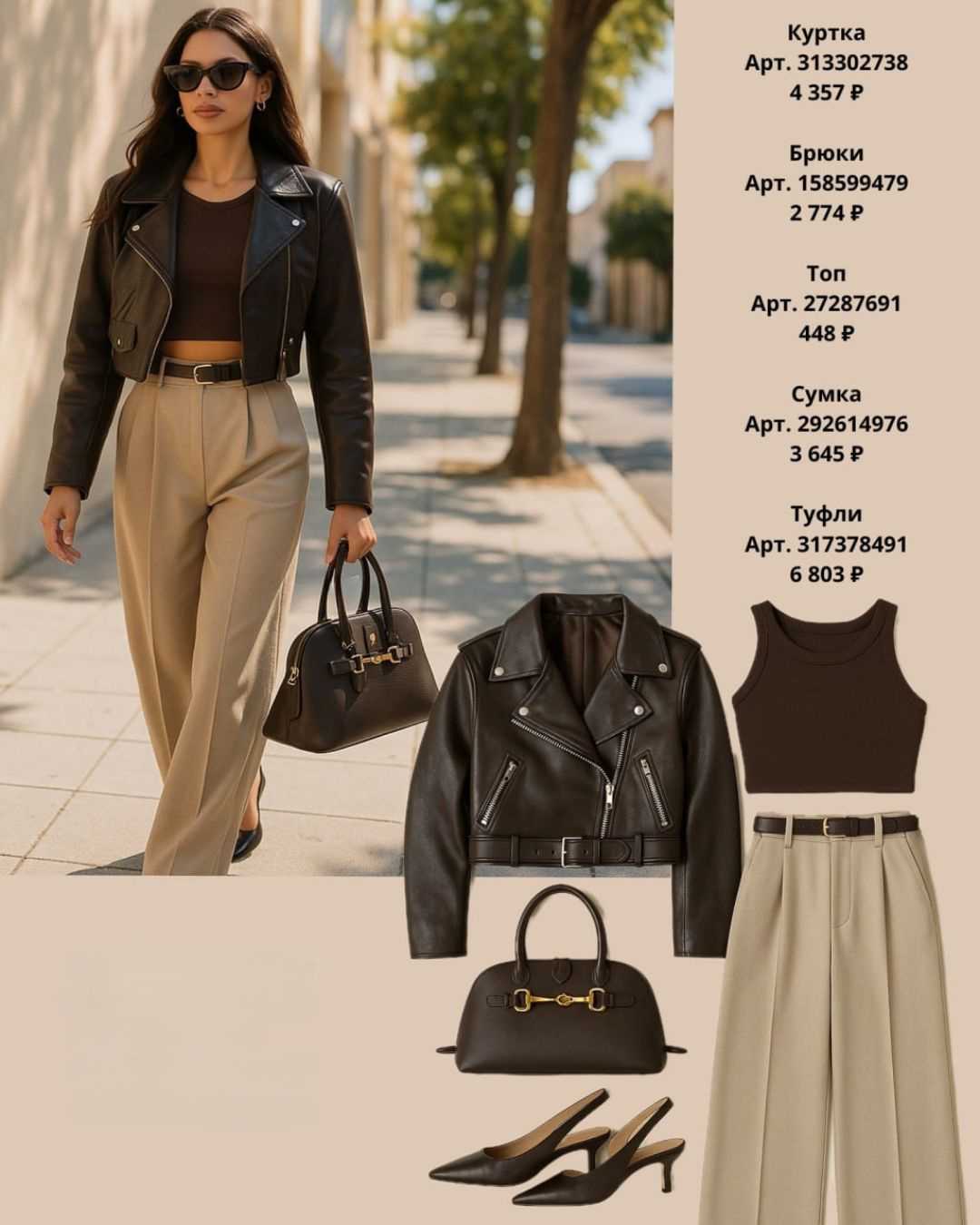 Тёмные акценты на фоне светлых брюк создают образ, который балансирует между утончённой строгостью и лёгкой дерзостью.
