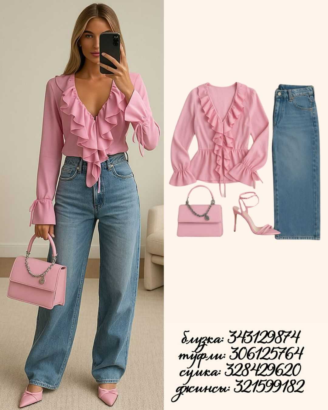 Нежные розовые акценты в сочетании с классическими синими джинсами создают лёгкий и стильный образ, который излучает уверенность и очарование.
